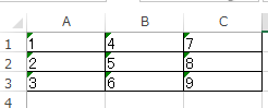 Excelで以下の様に文字列の書式で入力済の場合、セルの書式設定をまとめて数値へ変更しただけでは入力済の内容にまでは反映されません。