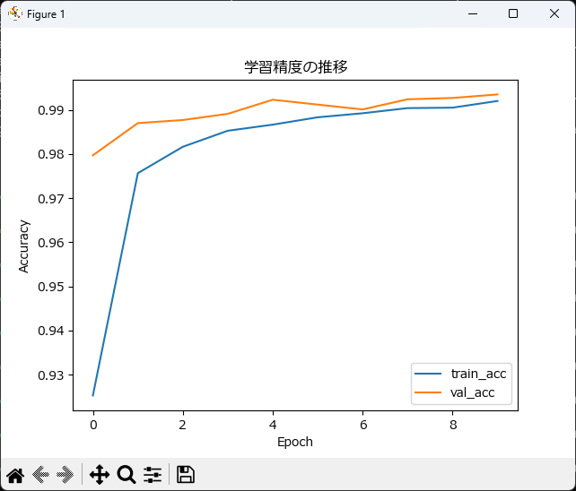 精度は 約99% に到達し、実用的な画像認識モデルの基礎が完成です。