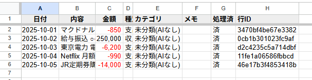 | 日付 | 内容 | 金額 | 種別 | カテゴリ | メモ | 処理済 | 行ID |
