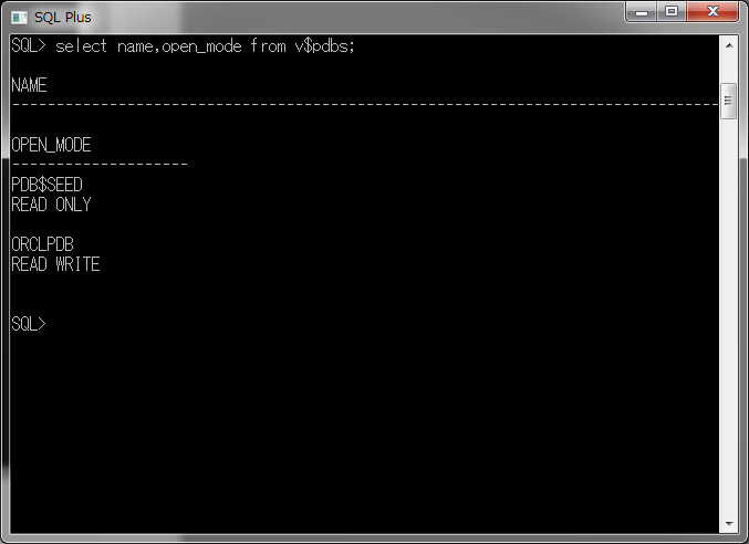 2. 次に「select name, open_mode from v$pdbs;」でPDBの名前と現在のOPEN_MODEを確認します。