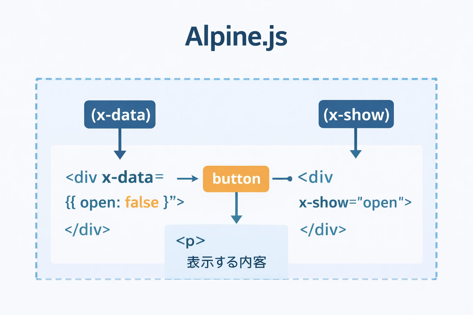 <div x-data="{ open: false }"> <!-- Alpine.js 管理下の要素 --> </div> |