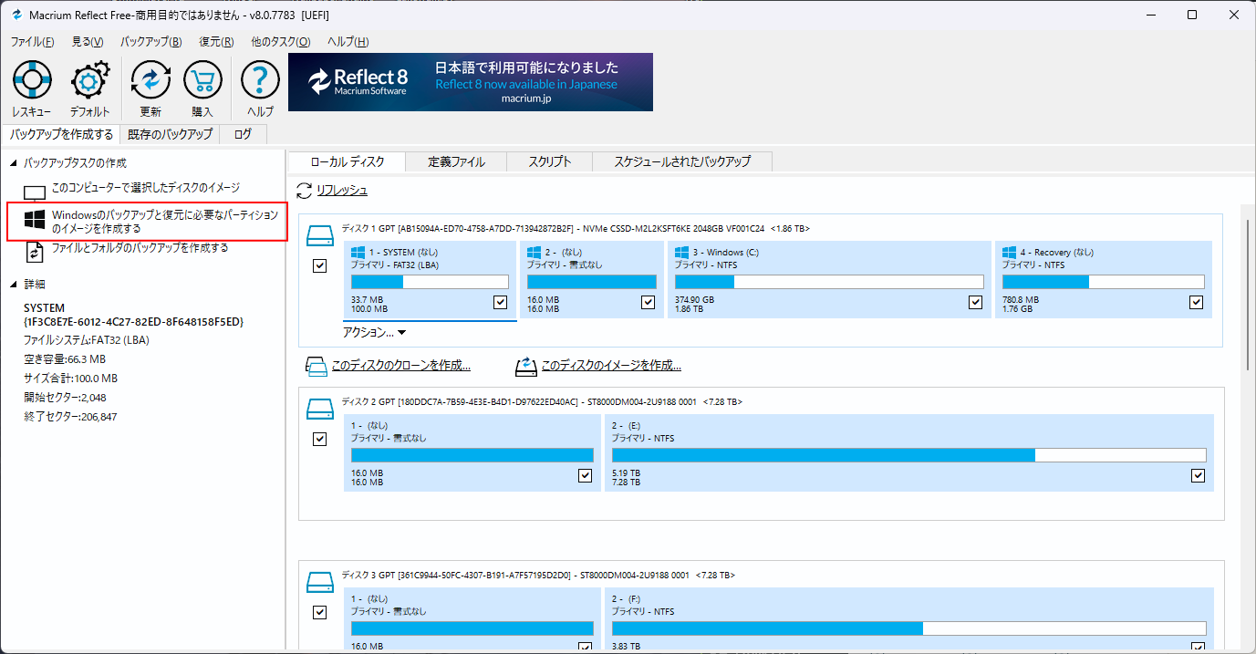 通常のファイルコピーでは、Windowsの起動に必要なシステム領域まで完全には保存できません。しかしMacrium Reflectなら、Windowsが起動するために必要なパーティションを含めてバックアップできます。