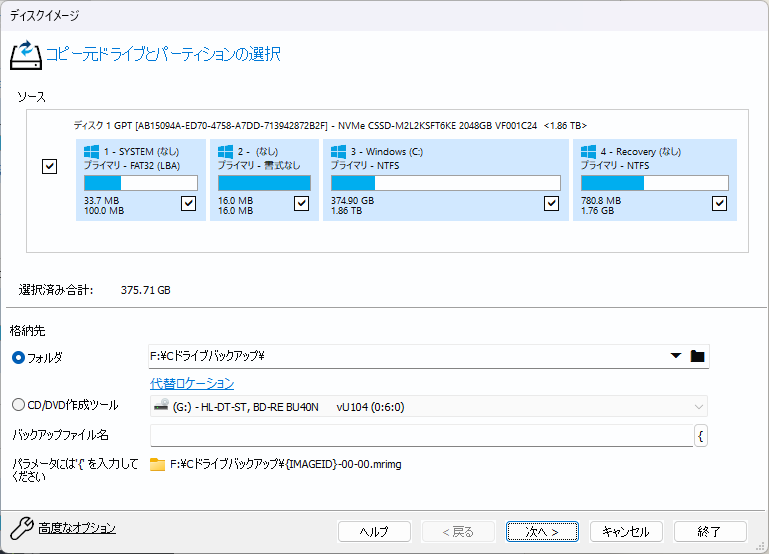 Cドライブを完全バックアップする手順