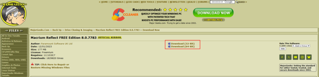 - Macrium Reflectの公式サイトから無償版をダウンロードします