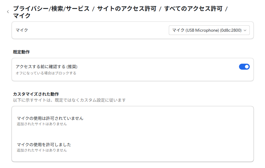 特定のWebサイトだけマイクが使えない場合は、サイト単位でブロックされている可能性があります。