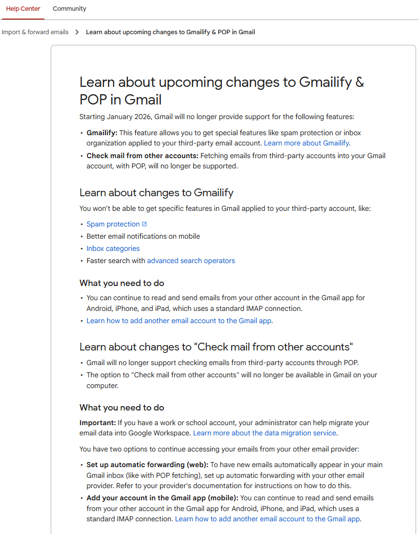 - Gmail’s POP3 external email fetching will be discontinued in January 2026.