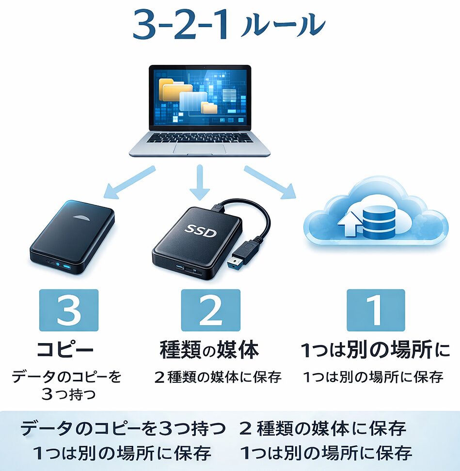 ビジネスデータでは、最低でも2系統、できれば3系統で管理した方が安心です。よく使われる考え方は、3-2-1ルールです。これは「3つのコピーを持ち、2種類の媒体に保存し、1つは別の場所に置く」という考え方です。
