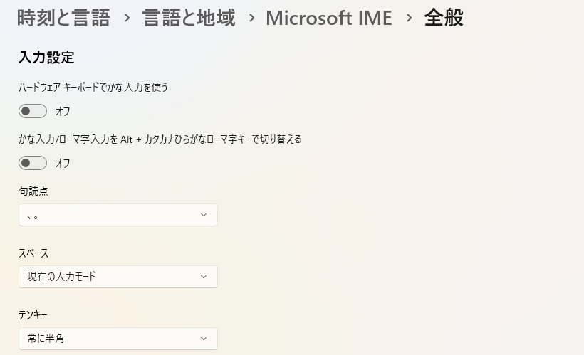 設定 → 時刻と言語 → 言語と地域 → Microsoft IME → 全般を確認し、