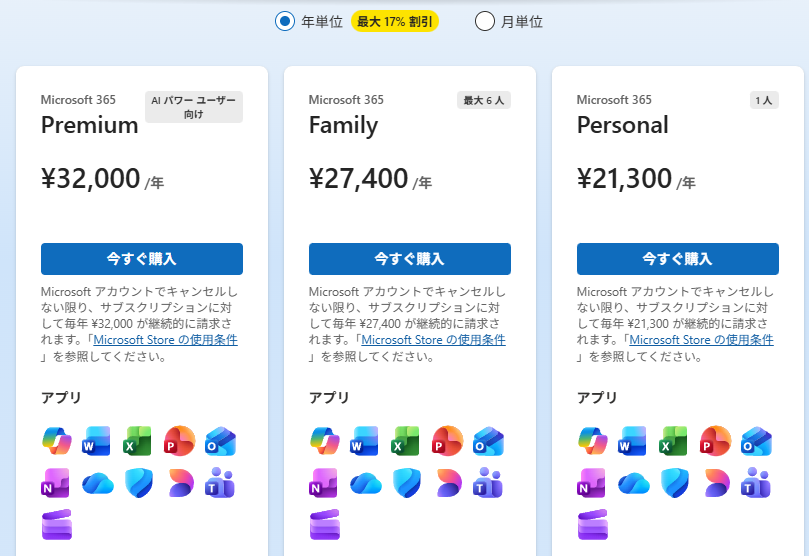 | Microsoft 365 Personal | 2,130円 | 21,300円 | 1人 | デスクトップ版Office・OneDrive1TB・AI機能などを含む標準プラン |