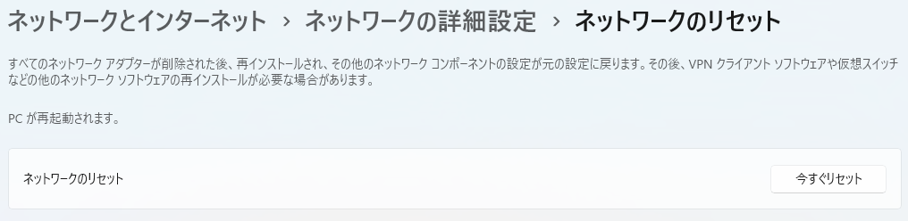 この操作はすべてのネットワークアダプターを削除し、再インストールします。VPN設定なども削除されるため注意が必要です。