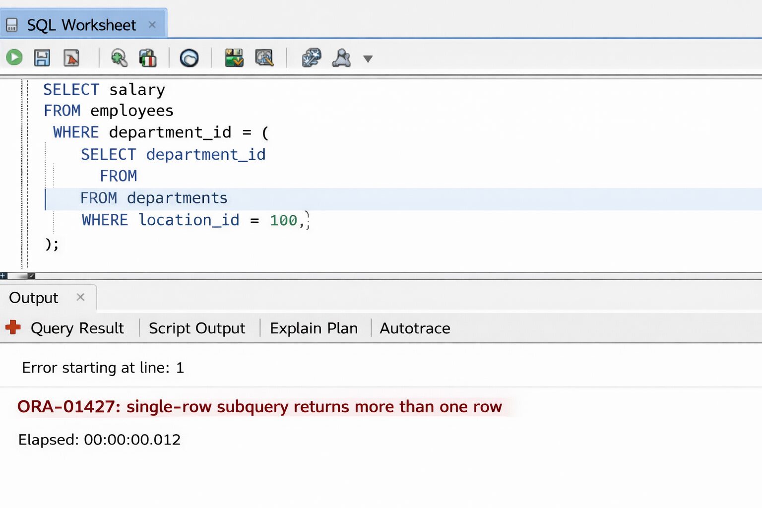ORA-01427 は、単一行副問合せ(Single-row Subquery) が