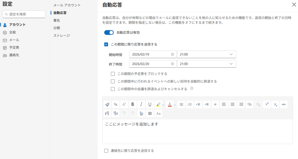| 自動応答を送信する | 不在通知を有効にする |