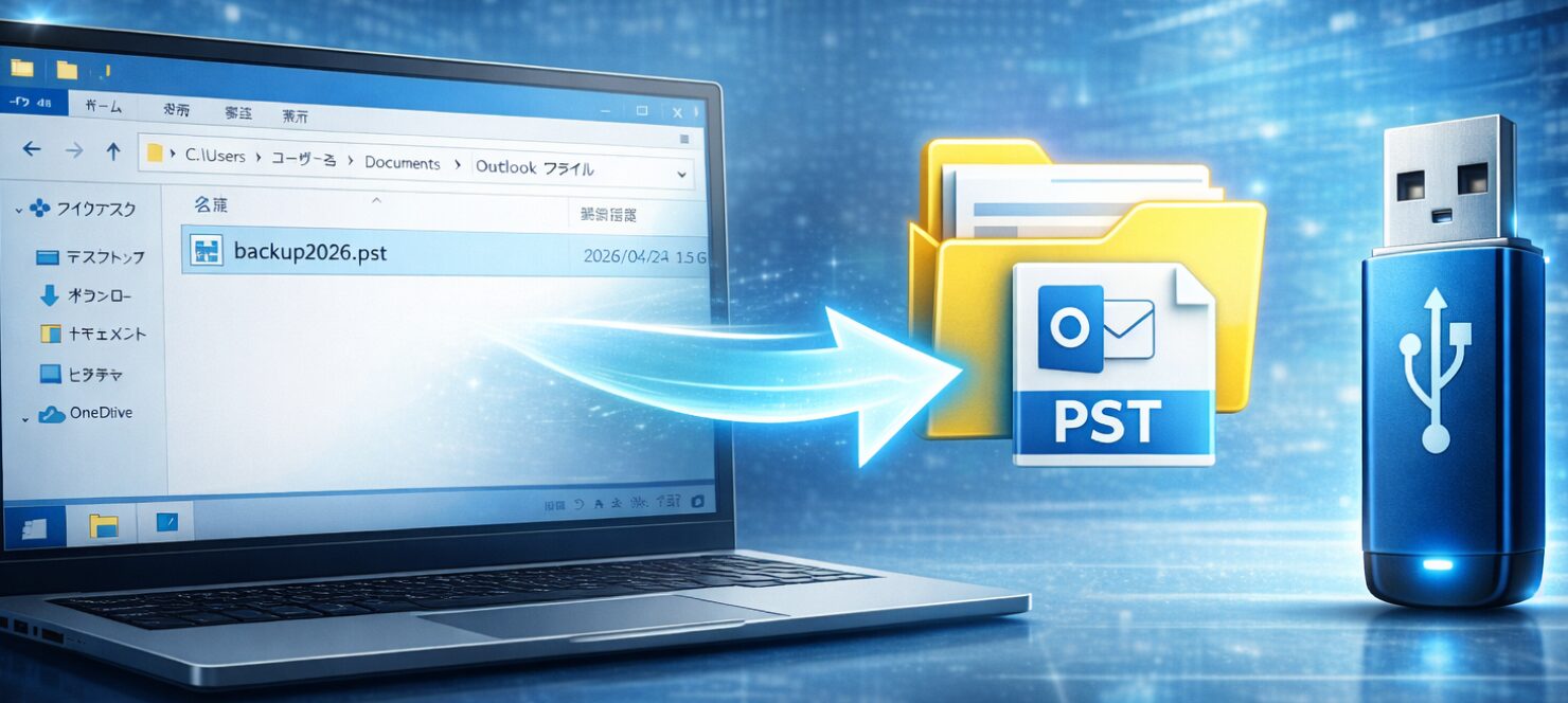 Outlookでは、メール・フォルダー構成・送信済みアイテム・連絡先・予定表などのデータが「Outlookデータファイル(.pst)」に保存されています。このファイルをコピーして新しいパソコンへ読み込むことで、同じ状態を再現できます。