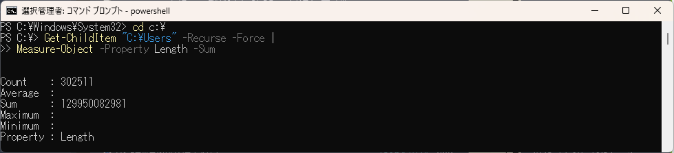 Get-ChildItem:フォルダ内のファイルを取得-Recurse:サブフォルダも含めて再帰的に取得-Force:隠しファイルも含めるMeasure-Object:ファイルサイズ(Length)を合計