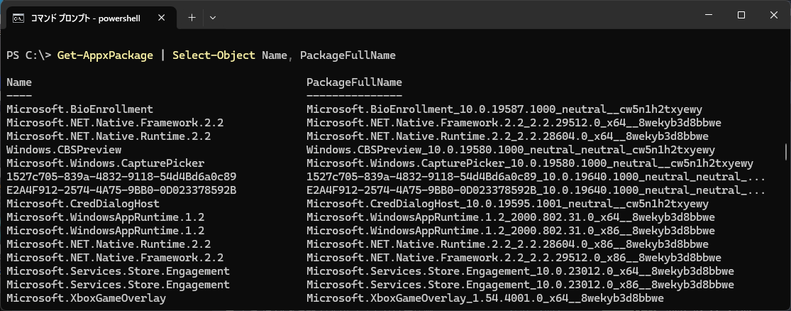 Get-AppxPackage | Select-Object Name, PackageFullName |