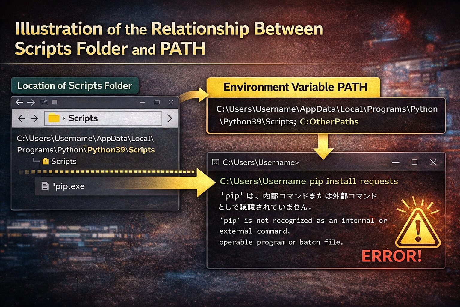 この Scripts フォルダが PATH に含まれていないと、pip コマンドは認識されません。