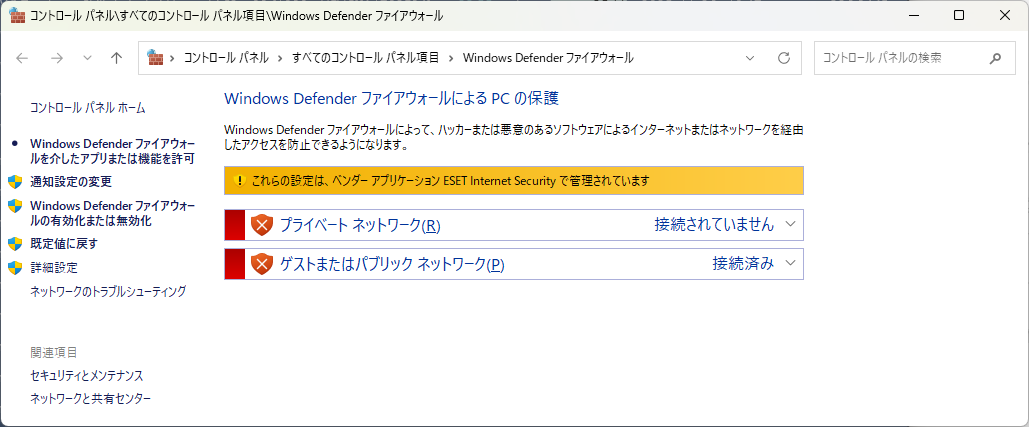 ※上記のように「これらの設定は、ベンダー アプリケーション ESET Internet Security で管理されています」と表示される場合、