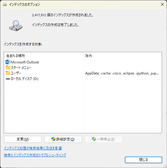 ・不要なフォルダーをインデックス対象から外す