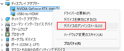 3. 使用中のGPUを右クリック → デバイスのアンインストール