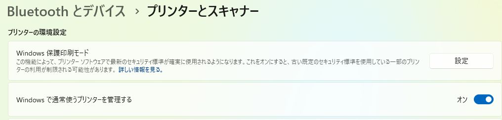 - 画面下部の「Windowsで通常使うプリンターを管理する」をオフにする