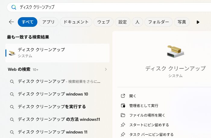 ディスク クリーンアップは検索から起動でき、Windowsでは「設定」→「システム」→「ストレージ」から「一時ファイル」や「クリーンアップ対象候補」でも空き容量を増やせます。
