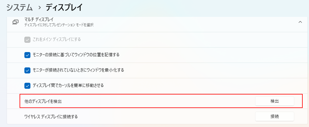 ここで他のディスプレイを検出から「検出」ボタンをクリックしてください。