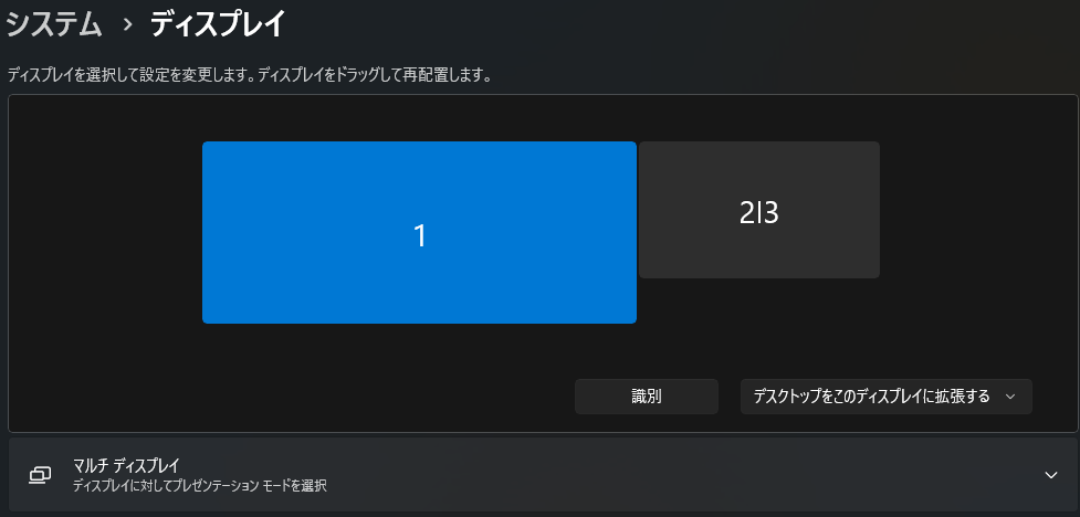 この画面で、Windows 11が認識しているモニター一覧を確認できます。通常は「1」「2」と番号が表示されます。