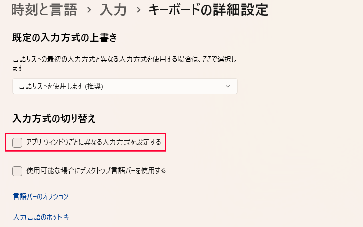 - 「アプリウィンドウごとに異なる入力方式を使用する」の