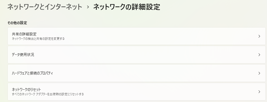 - 「ネットワークとインターネット」→「ネットワークの詳細設定」