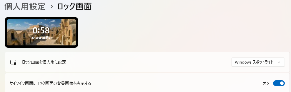 設定後は、Windowsキー+Lでロック画面を開くと変更が反映されているか確認できます。