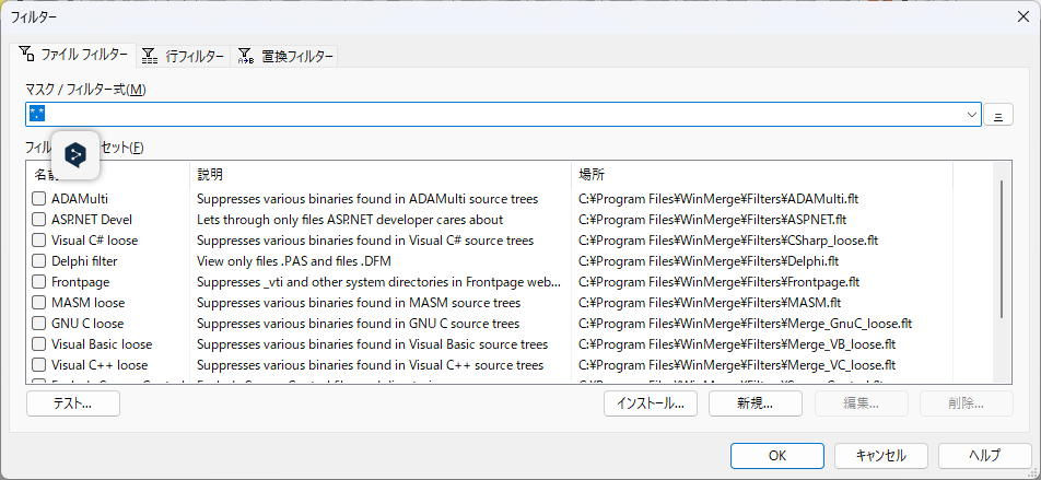 WinMerge には、あらかじめ用意されたフィルターがいくつか存在します。