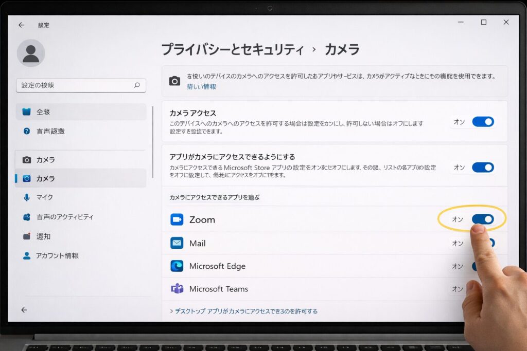 WindowsやmacOSのプライバシー設定を開き、Zoomにカメラ利用が許可されているか必ず確認してください。