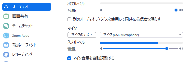 また、マイクのテスト機能を使い、入力レベルメーターが動くかどうかも必ず確認してください。メーターが全く反応しない場合、Zoomがマイク音声を受け取れていない状態です。